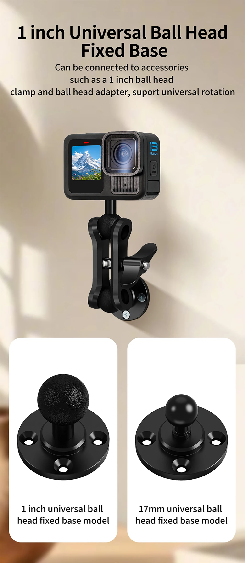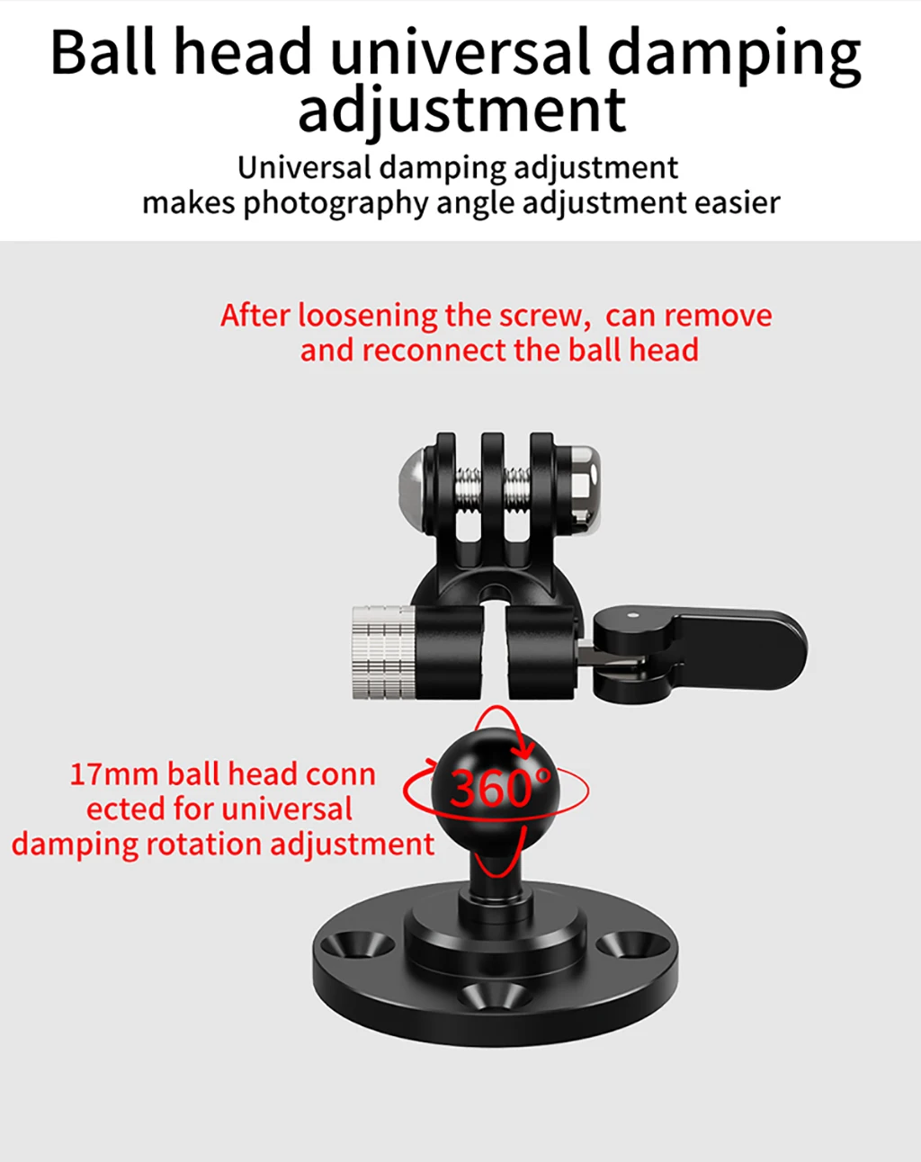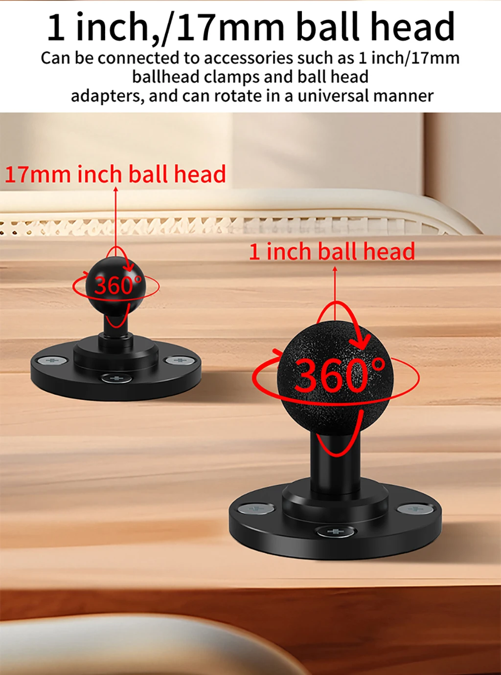 • Ball Head Setup: Snap 17mm/25.4mm ball heads into socket; tighten knob to lock angle.