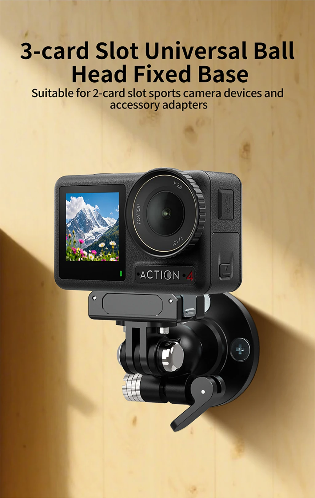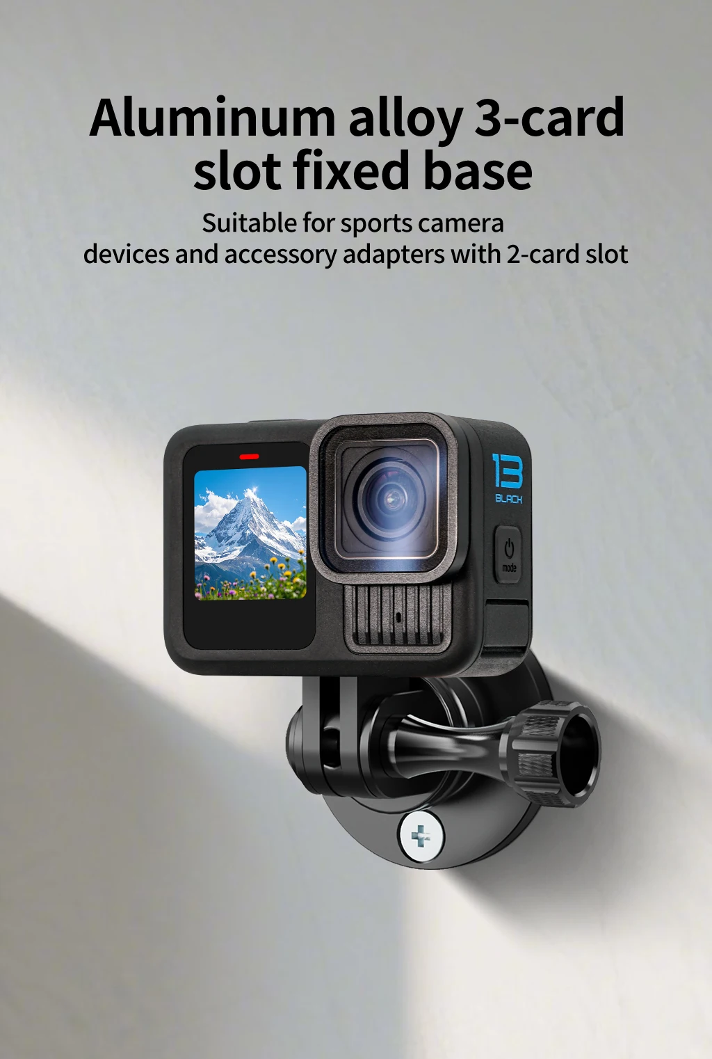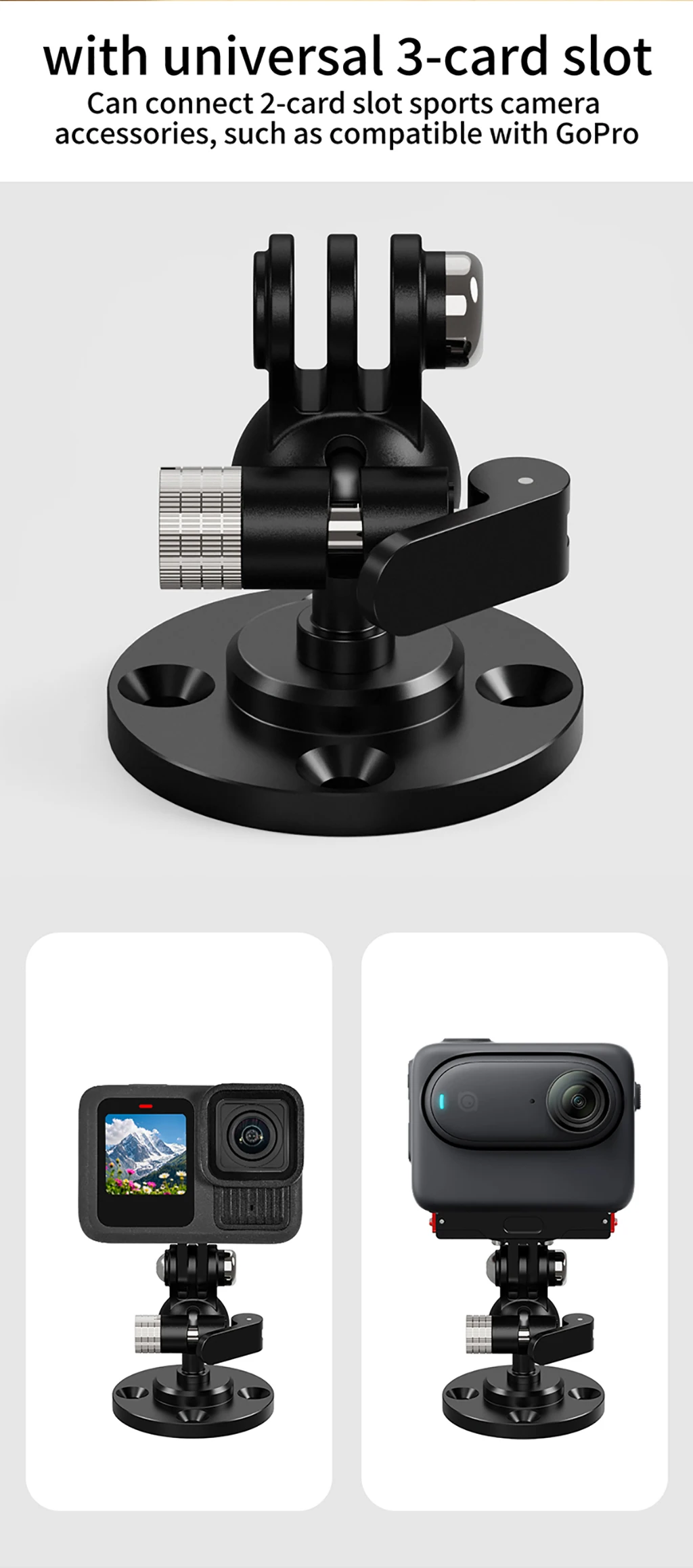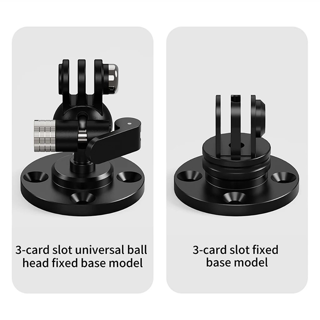 Lock GoPro/DJI Action cameras via 3-card slots—compatible with all accessory adapters.