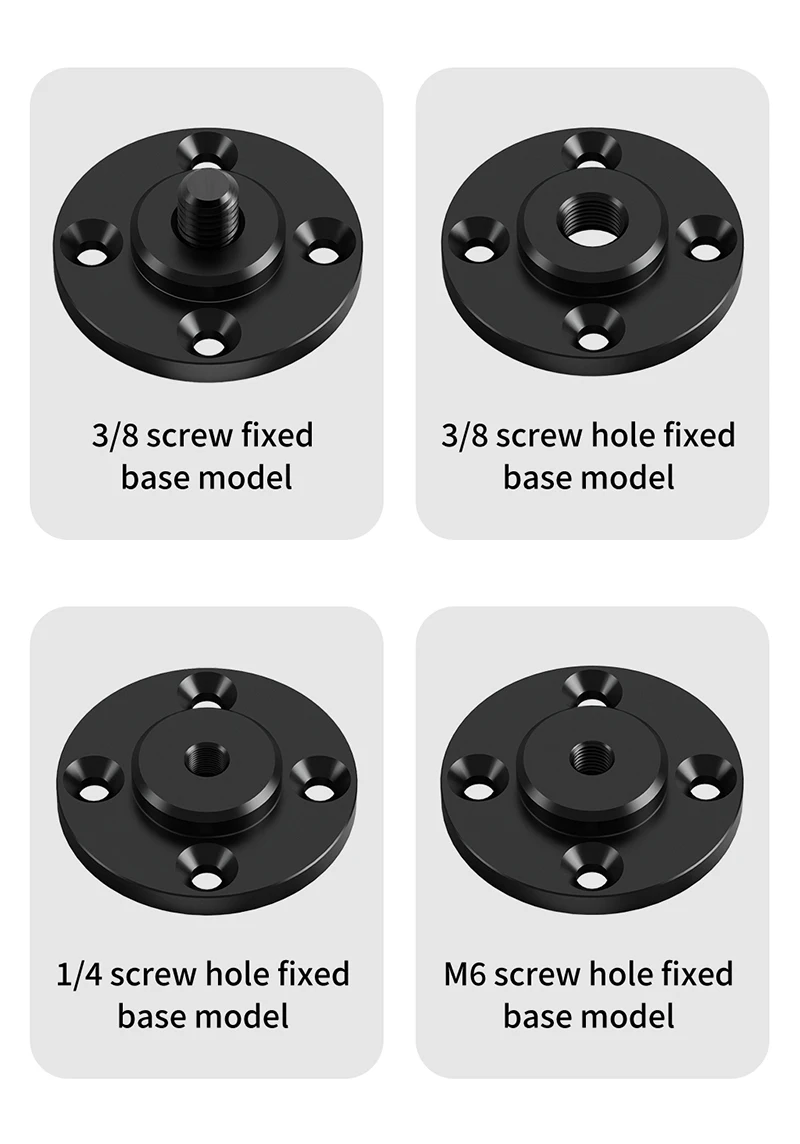 1. Choose the Right Model: Select the mount base configuration that matches your camera, monitor, or accessory’s thread size (1/4”, 3/8”, M6).