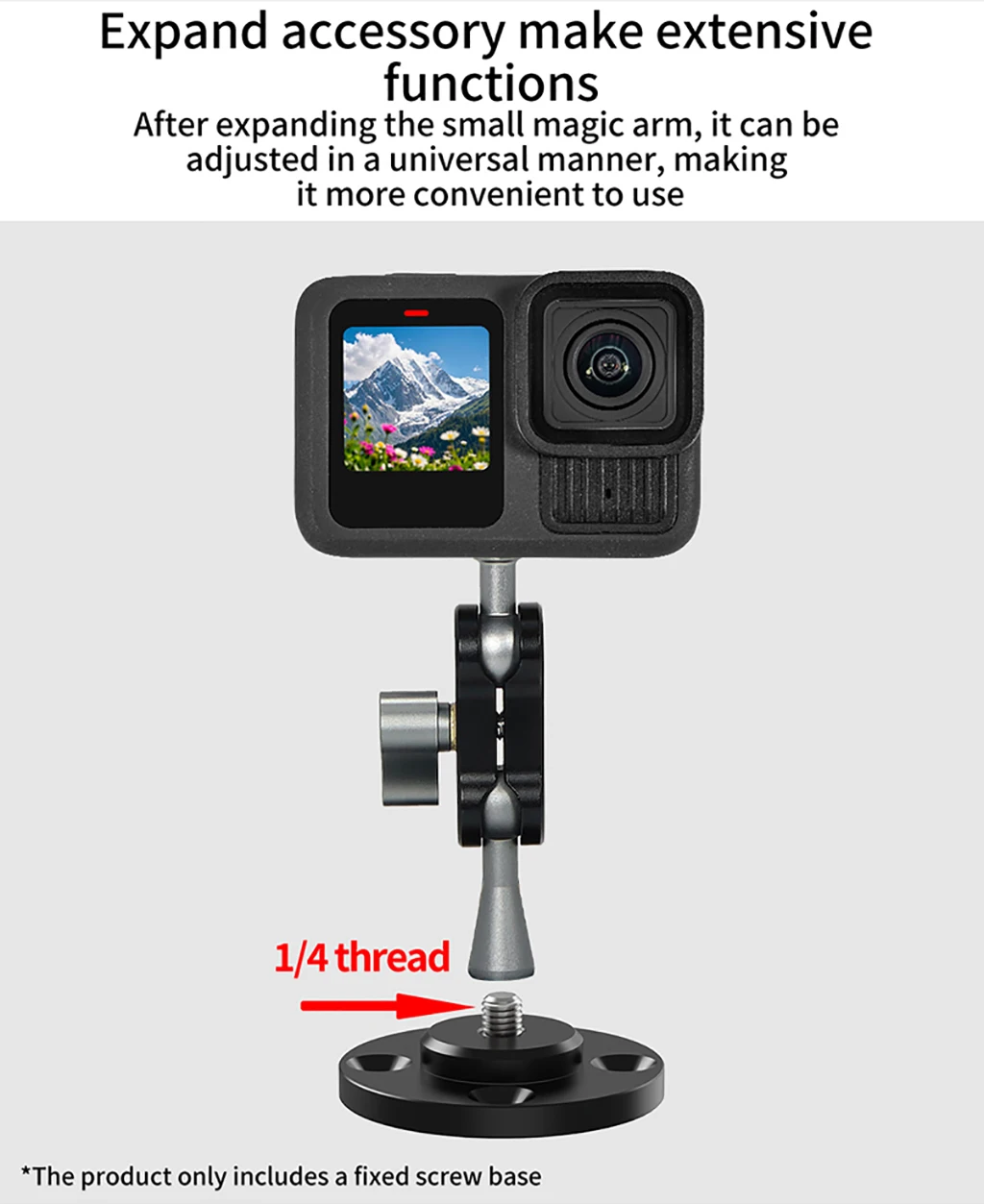 • Magic Arm Attachment: Thread 1/4” or 3/8” studs into base holes; extend arms for overhead shots.
