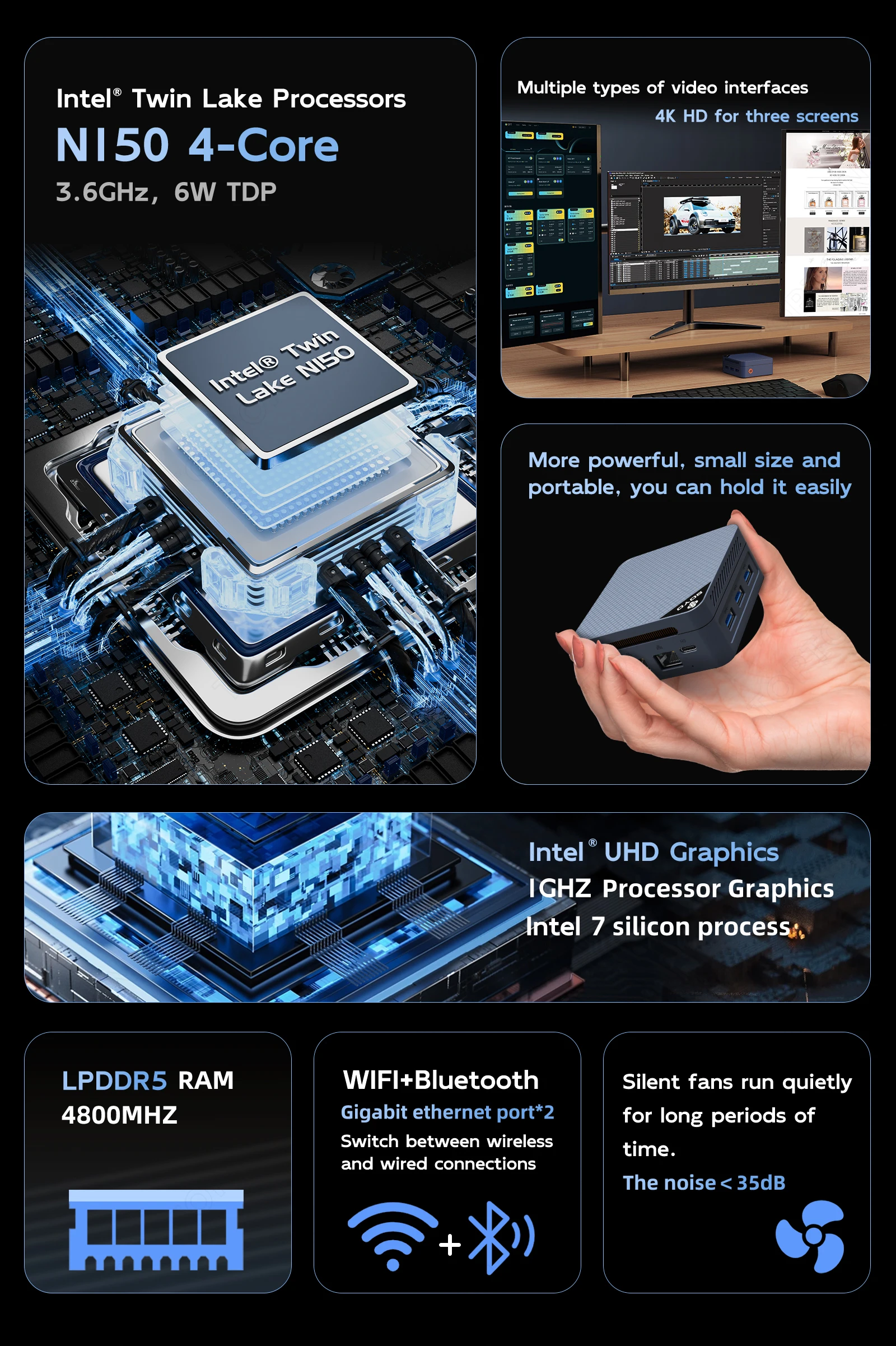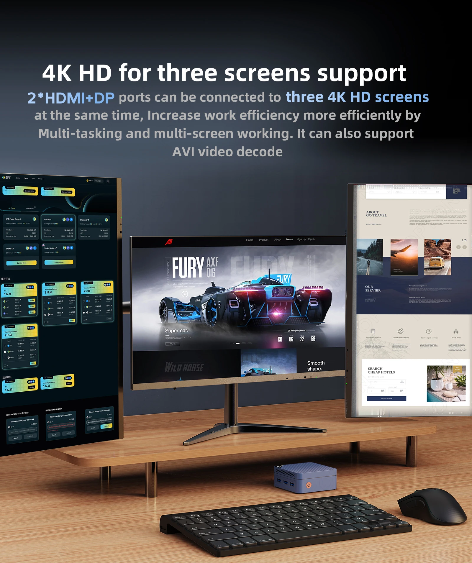 4K HD for three screens support 2*HDMI+DP ports can be connected to three 4K HD screens