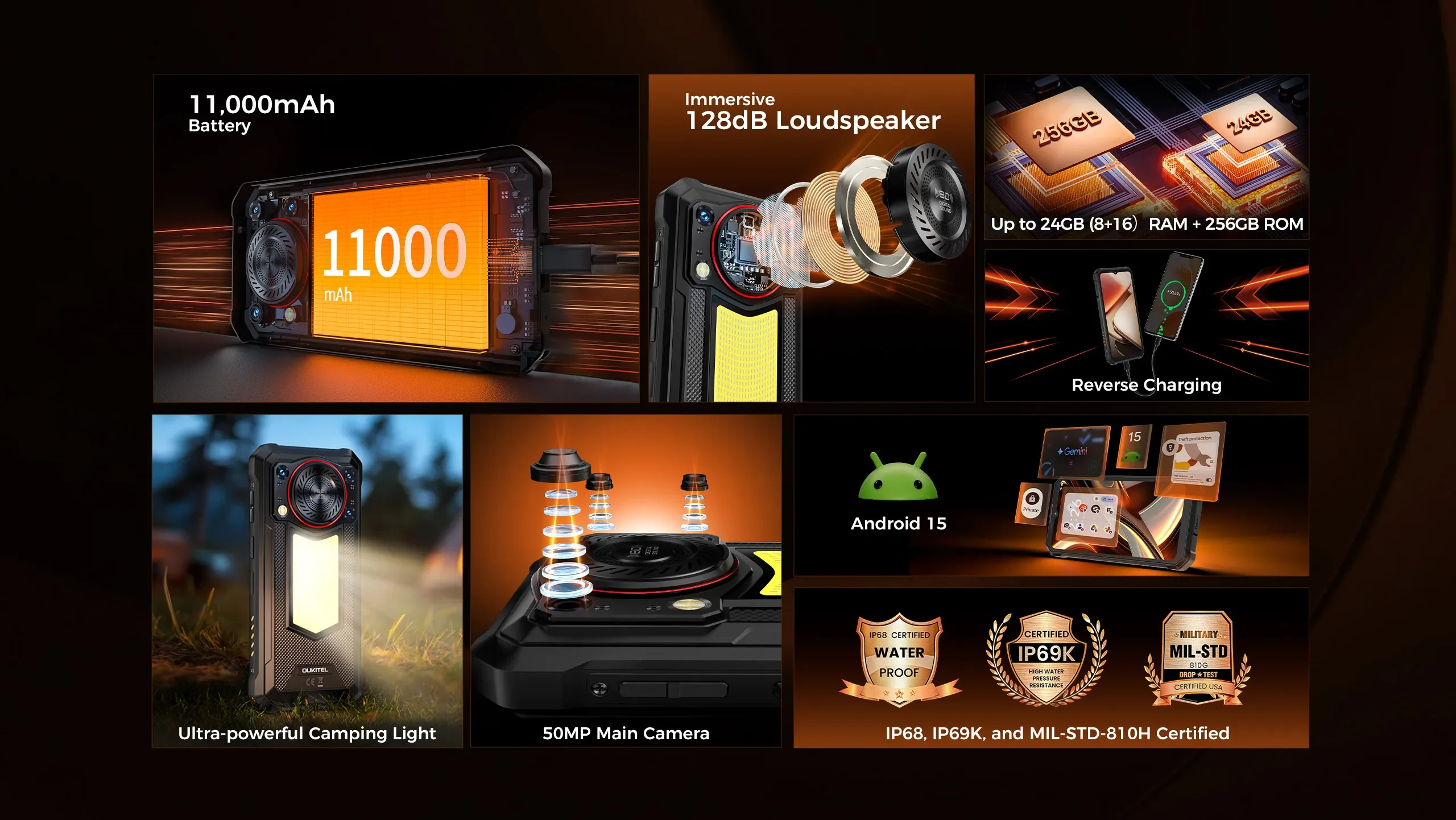 OUKITEL WP53 PRO 4G Rugged Smartphone Android15 6.52 Inch 24GB RAM+256GB ROM Mobile Phone 11000mAh 50MP 18W Cell Phones NFC