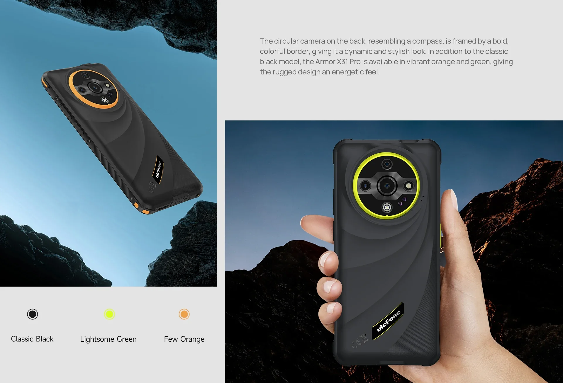 The circular camera on the back, resembling a compass, is framed by a bold, colorful border, giving it a dynamic and stylish look. In addition to the classic black model, the Armor X31 Pro is available in vibrant orange and green, giving the rugged design an energetic feel.