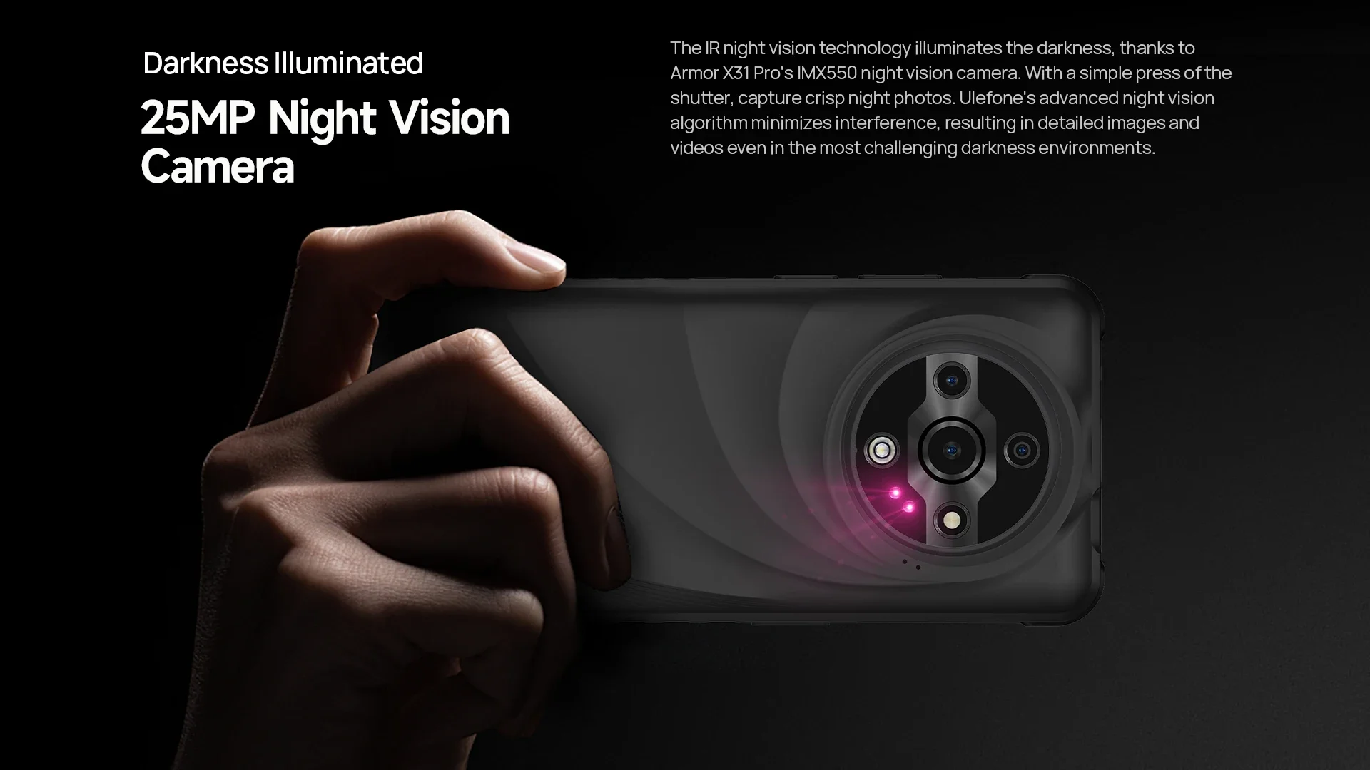 The IR night vision technology illuminates the darkness, thanks to Armor X31 Pro's IMX550 night vision camera. With a simple press of the shutter, capture crisp night photos. Ulefone's advanced night vision algorithm minimizes interference, resulting in detailed images and videos even in the most challenging darkness environments.