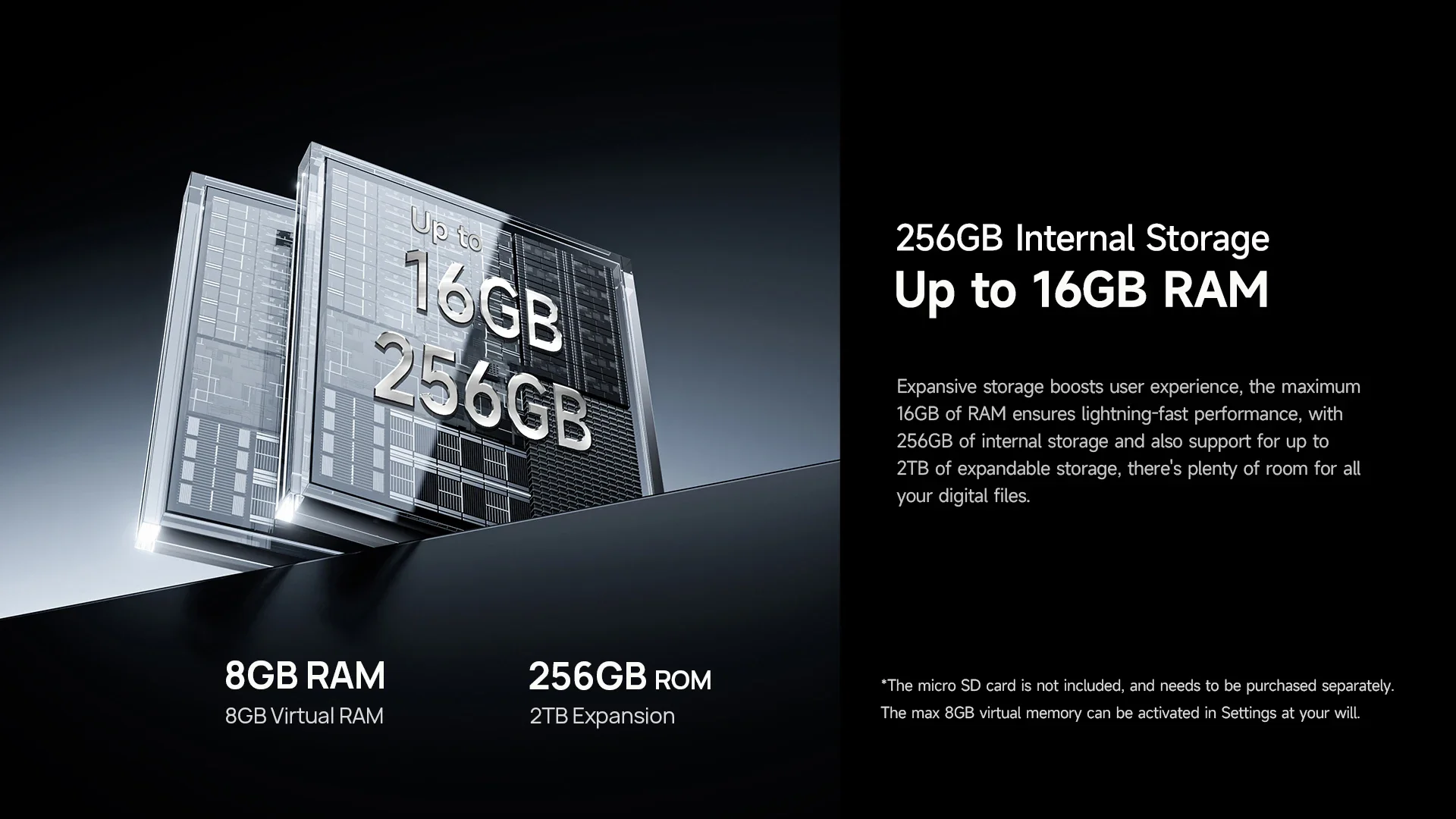 Expansive storage boosts user experience, the maximum 16GB of RAM ensures lightning-fast performance, with 256GB of internal storage and also support for up to 2TB of expandable storage, there's plenty of room for all your digital files.