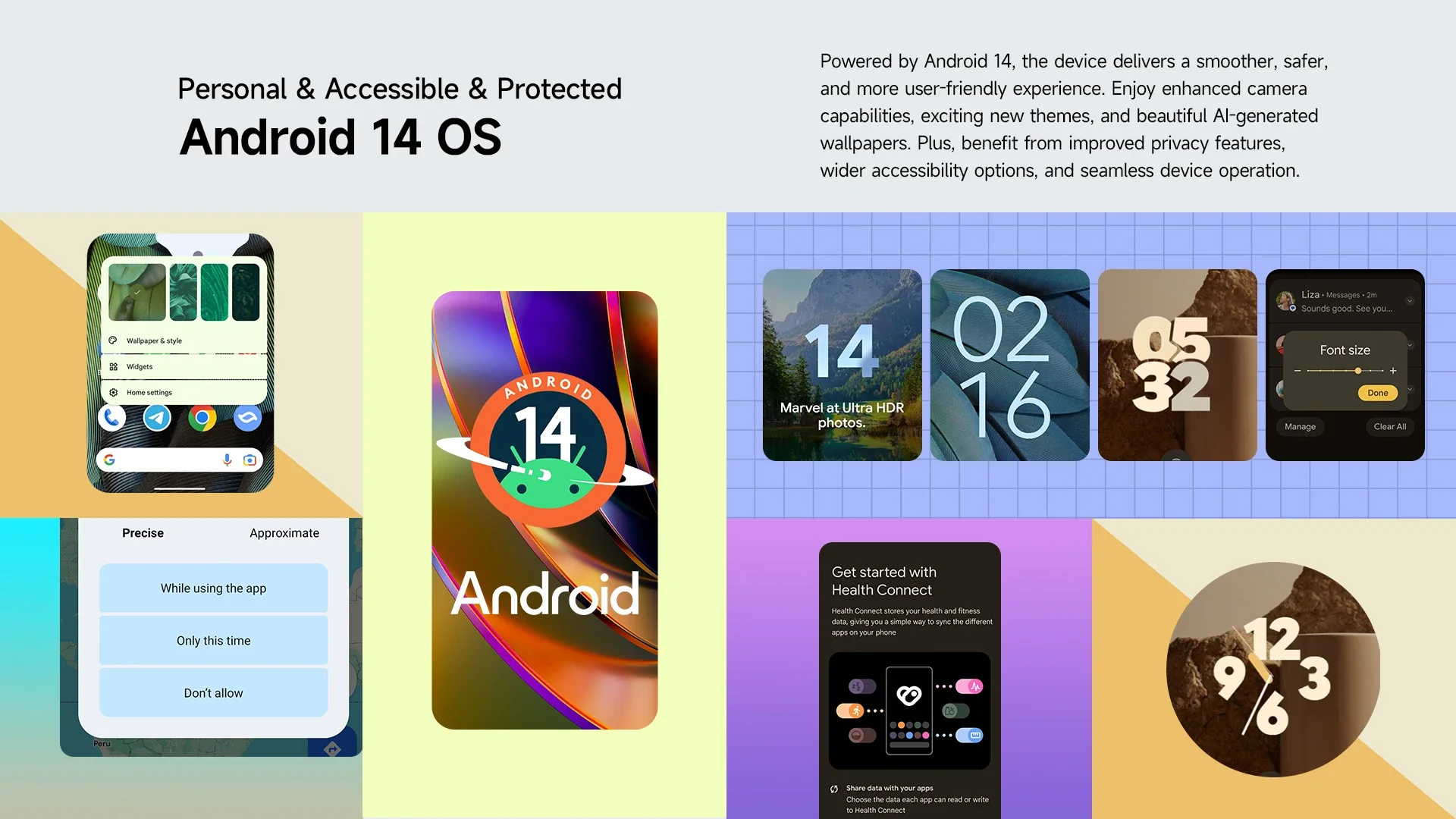 Powered by Android 14, the device delivers a smoother, safer, and more user-friendly experience. Enjoy enhanced camera capabilities, exciting new themes, and beautiful AI-generated wallpapers. Plus, benefit from improved privacy features, wider accessibility options, and seamless device operation.
