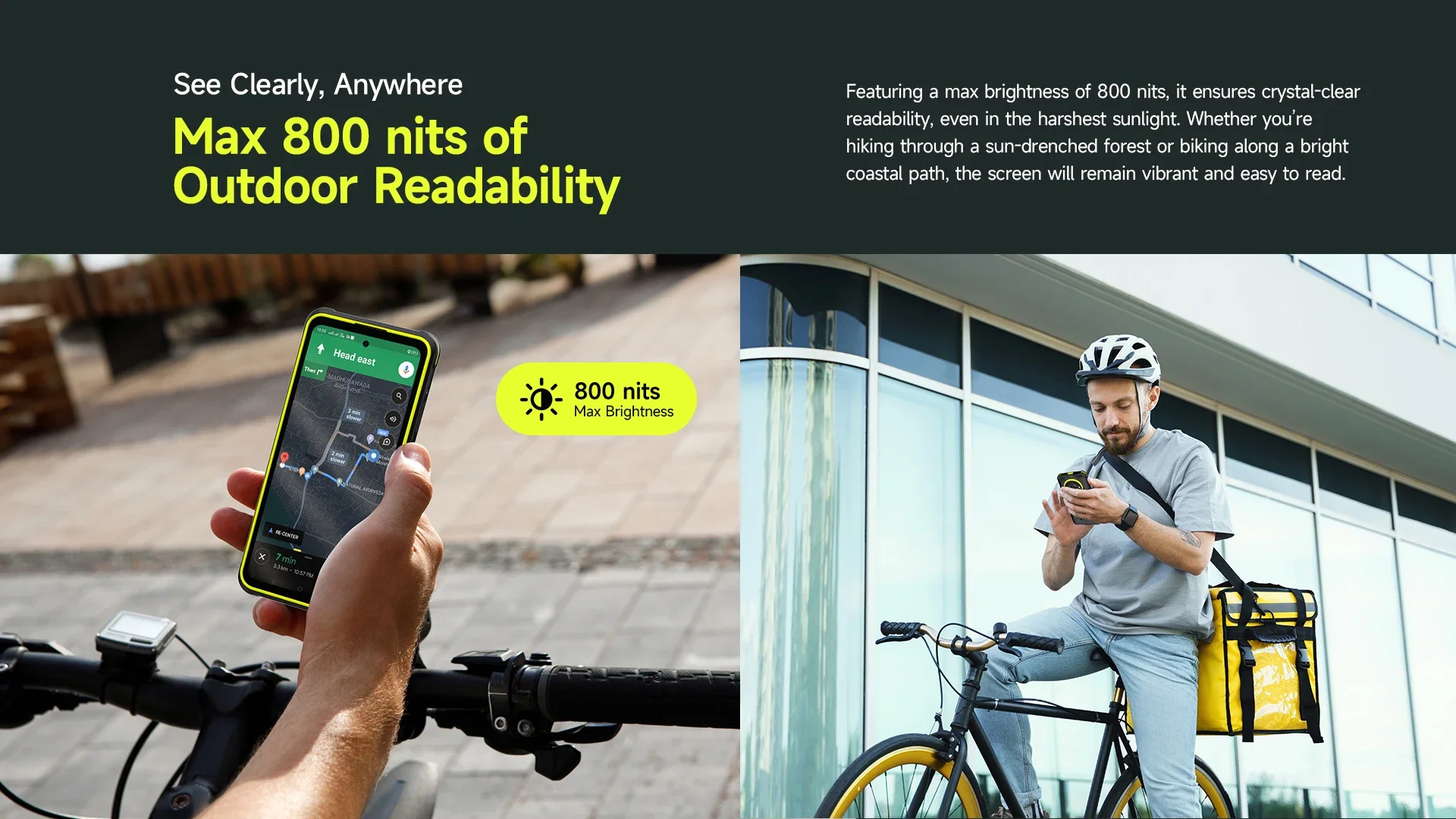 Featuring a max brightness of 800 nits, it ensures crystal-clear readability, even in the harshest sunlight. Whether you're hiking through a sun-drenched forest or biking along a bright coastal path, the screen will remain vibrant and easy to read.
