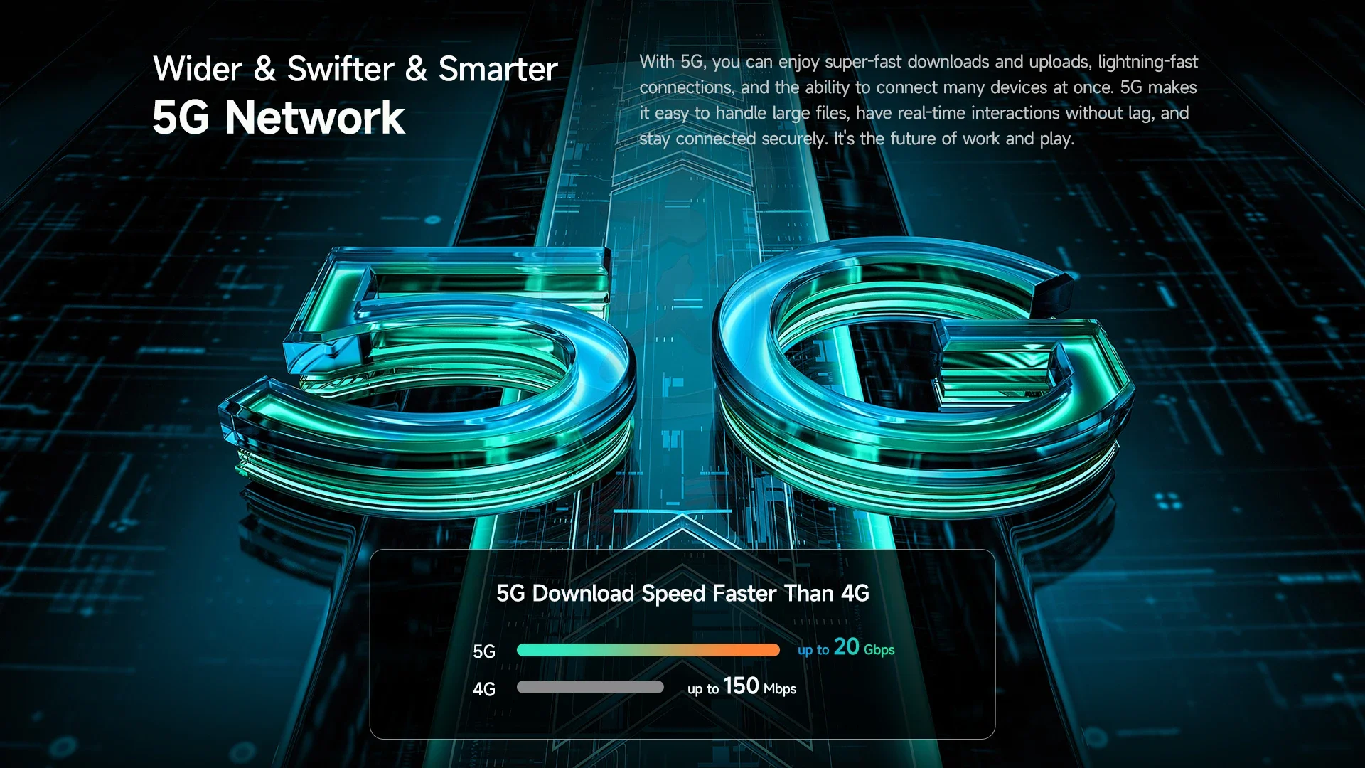 With 5G, you can enjoy super-fast downloads and uploads, lightning-fast connections, and the ability to connect many devices at once. 5G makes it easy to handle large files, have real-time interactions without lag, and stay connected securely. It's the future of work and play.