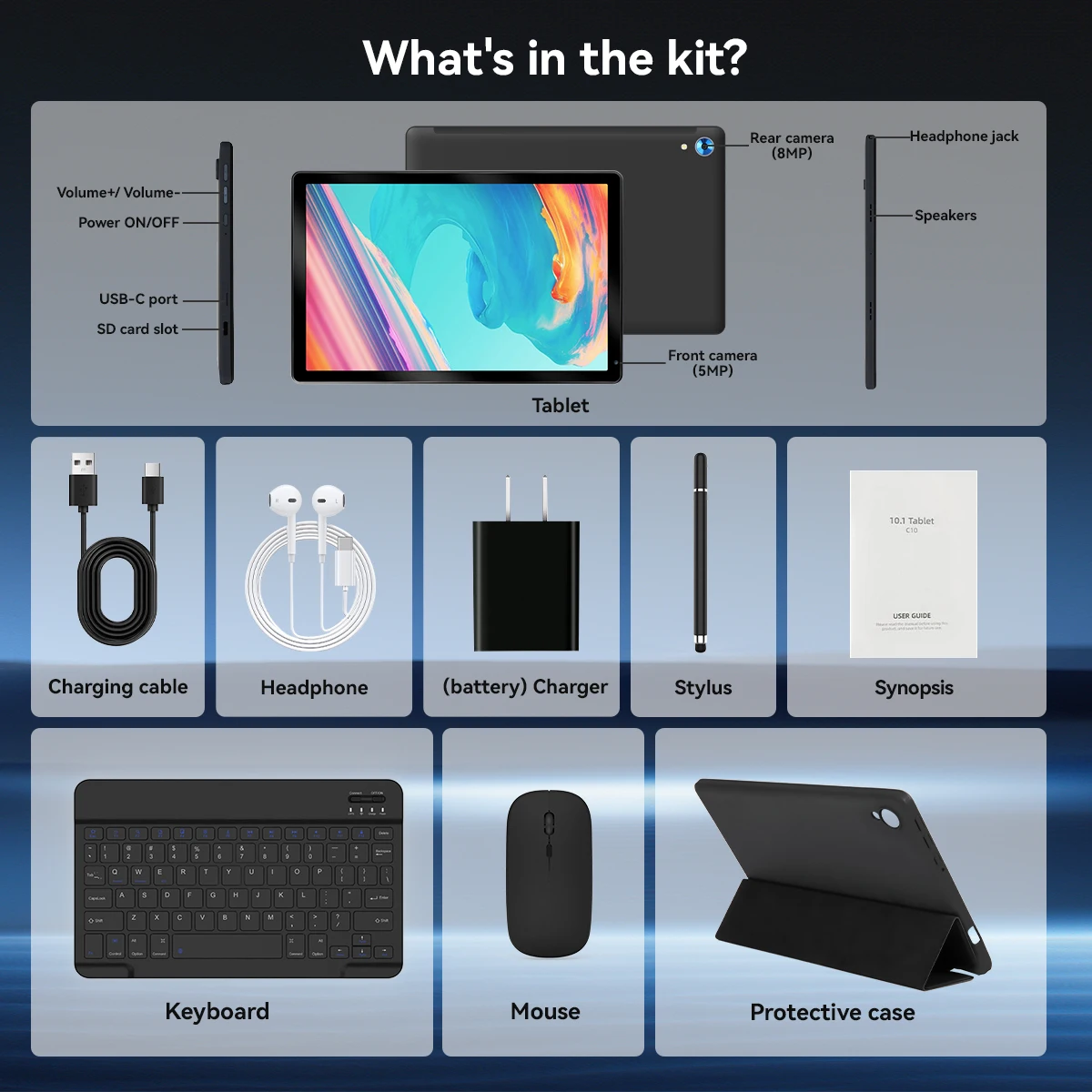 - 【Large Capacity Battery with Fast Charge】The built-in large capacity and low consumption CPU enable our 10 inch tablet to stand by for up to 3 days and allows you to enjoy up to 8 hours of mixed reading, watching TV shows, playing games, surfing the web. Our tablet adopts fast-charging technology which can be fully charged in 1.5 hour and easily charge via the USB Type-C port and rest assured the battery will last. It is a good companion for you to play and study!
