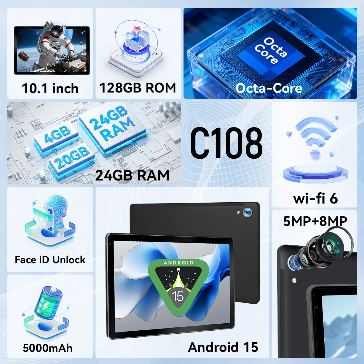 - 【High Performance】Our Android tablet features the latest operating system Android 15 and an 2.0 GHz octa-core processor ensure of excellent performance, seamless multitasking, getting rid of annoying ads, emphasizing privacy and security by designing enhanced app permissions, providing you complete management control.