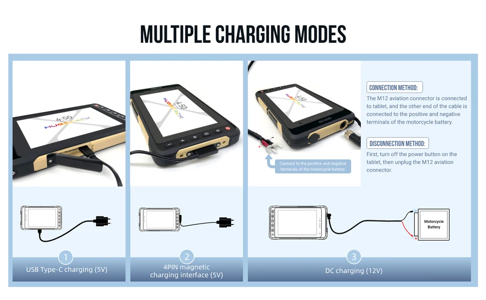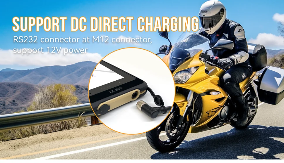 2. DC 12V directly supplies power to the system, without going through the battery. It can be used while charging without affecting the built-in battery, even you remove the battery. DC 12V direct power supply is most commonly used in motorcycles, where it can be charged directly from the motorcycle's battery. The advantage of this is that when you are riding outdoors, it won't cause the lithium battery to alarm, reboot, or even shut down due to high outdoor temperatures.
