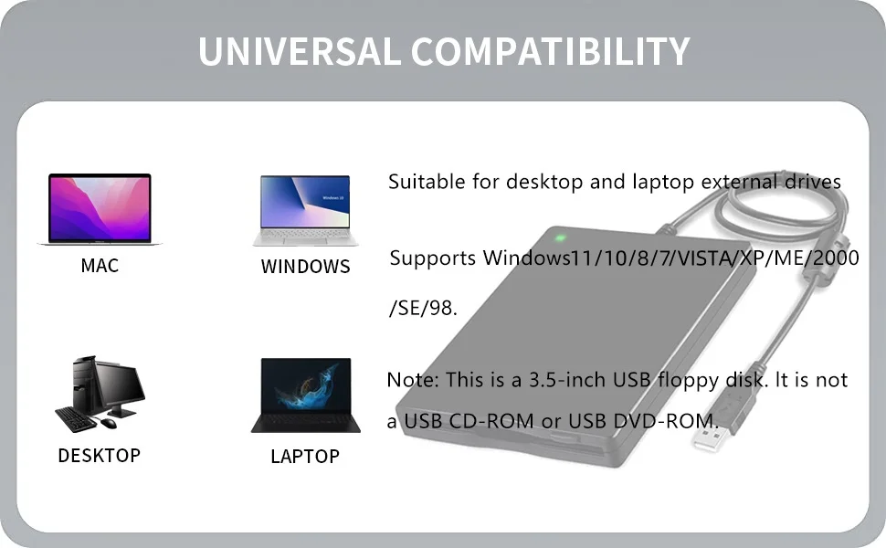• Read/Write 720KB/1.44 MB capacity floppy disk, compatible with Mac Windows 98/SE/2000/ME/XP/VISTA/Windows 7/8/10/11 PC Laptop Desktop, compatible for Dell Acer Sony HP Lenovo etc, can use for industrial machines.