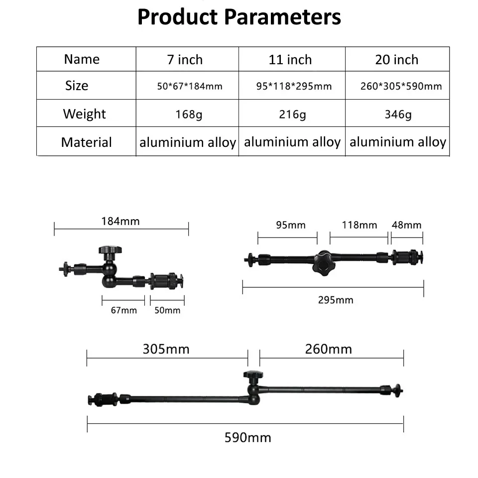 Professional 7/11/20" magic arm that is perfect for mounting your LCD on camera, LED light on camera or on your rig.