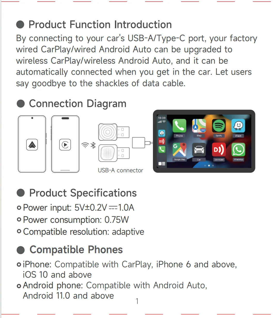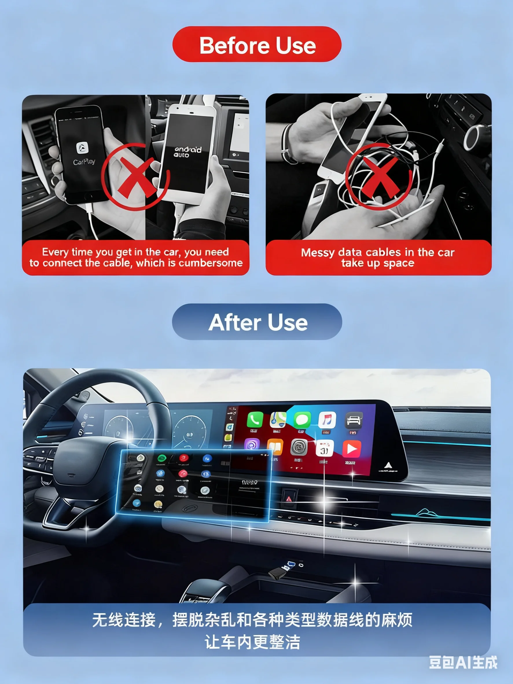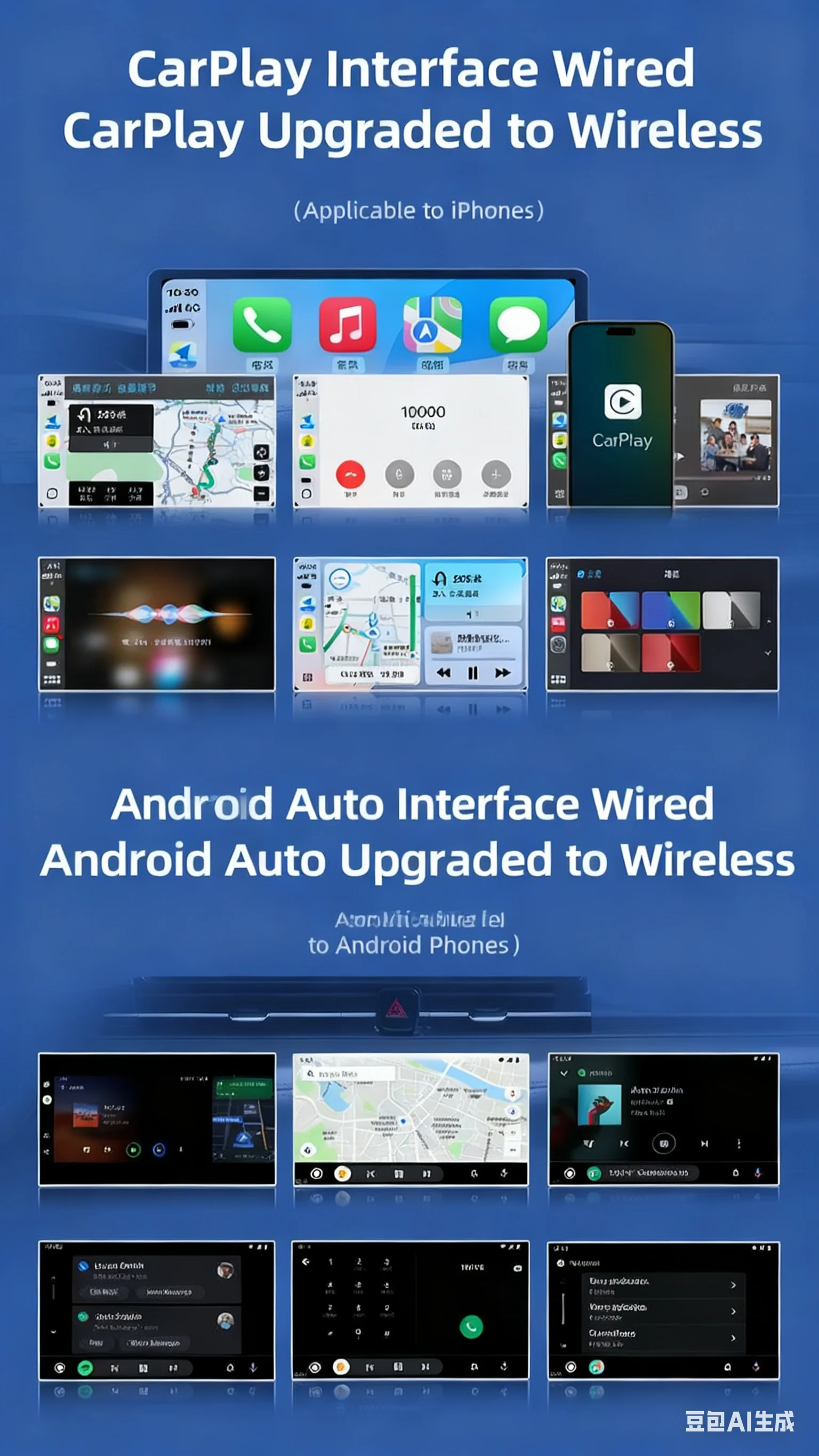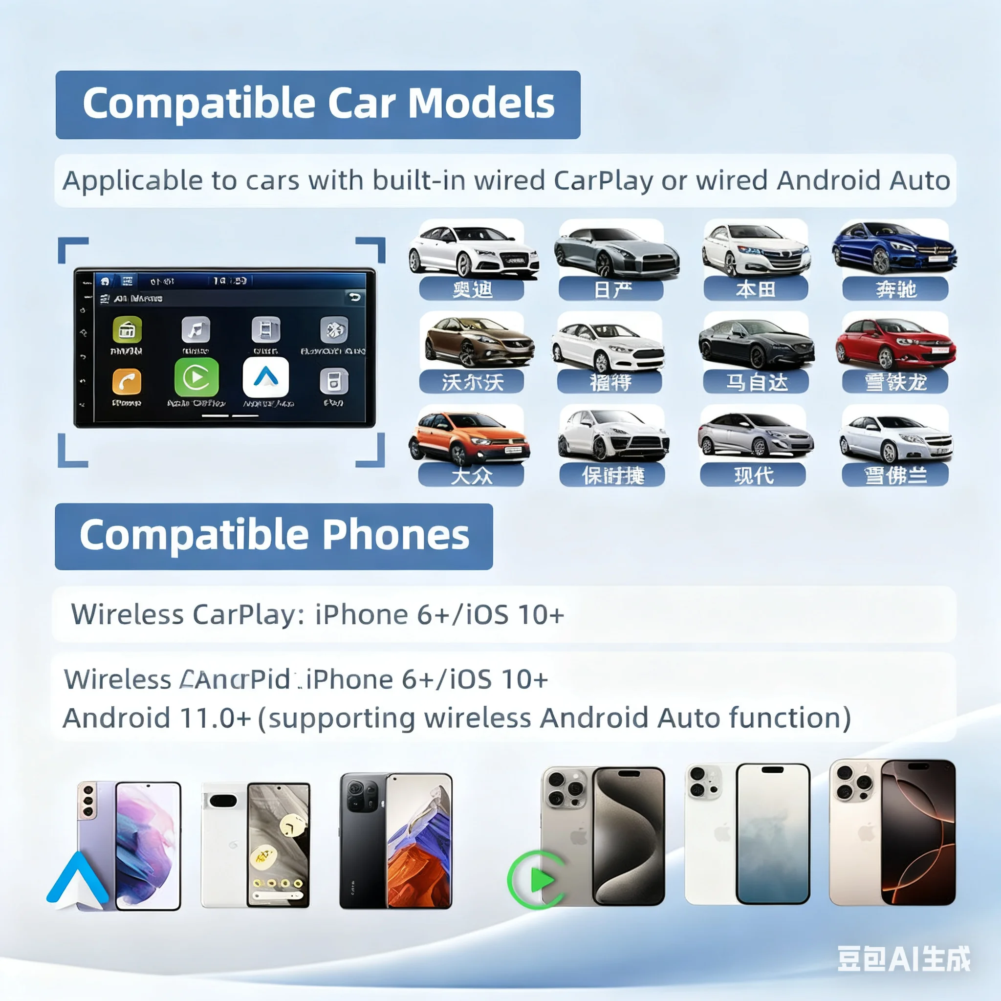 2.Supports wired to wireless CarPlay & wireless Android Auto, BT pairing, and Wi-Fi transmission.