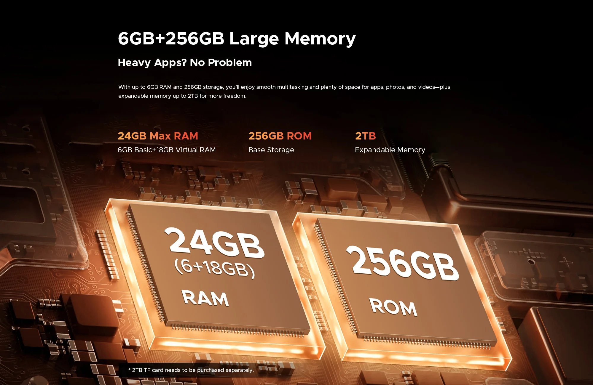 Memory and storage: 24GB RAM ( 6GB+Up to 18GB Extended RAM) + 256GB ROM